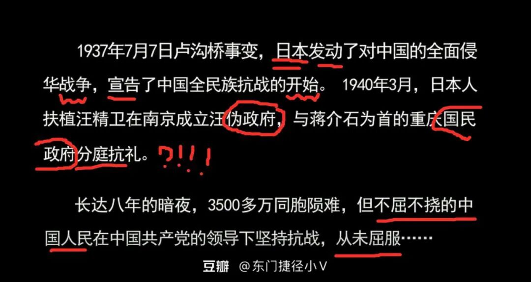 是非善恶都荡然无存的结果,还要“归功于”天下第一门派?不应该让丫自绝于全人类吗?寥寥数语,就能让我经历一场头脑大爆炸,这文案功底太强了。看看集大成者《局中人》吧!保你通身舒爽,如遭雷劈。这段对片头字幕的批改来自豆瓣该剧词条下的剧评,作者 @东门捷径小V ,原po戳文末“原文阅读”可抵达。短短两段文字,错误多到离谱。“日本宣告中国全民族抗战的开始”,“汪伪政府与国民政府分庭抗礼”,“不屈不挠的中国人民从未屈服”,一共三句,每句都错。除了原po批改的这些以外,还有“陨难”这个奇怪的词,形容人失去生命,你要么说“殒身”,要么说“陨灭”,再白一点说“遇难”,哪来的陨难?但凡找个高中毕业的文化人儿通读一下稿子,也不能犯这么多错误啊。不过这只是片头字幕,一晃而过没有画外音读出来的那种,所以被大家挑刺以后,片方把平台片源里的字幕替换过了,现在你们能看到的是这样:行吧,也算有羞耻之心。但说实话,就这段新换的文字也不是全无毛病。一个谍战剧,连片头字幕都能做得错漏百出,你指望它能讲出什么逻辑严谨的好故事?