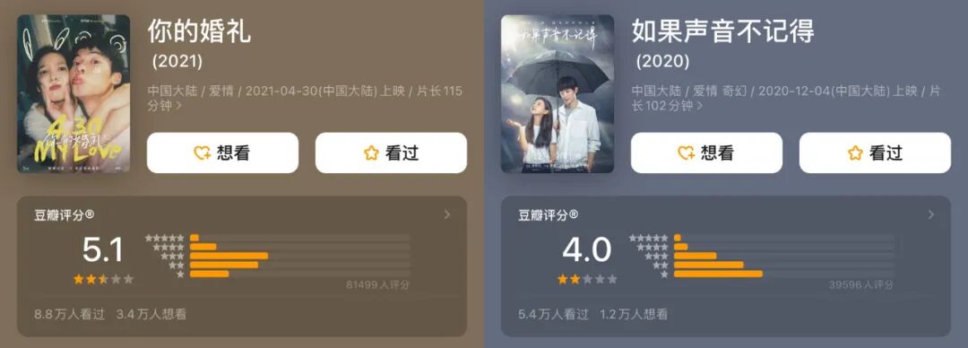 但在纯爱烂片上,这位姐在青春光线的加持下继续猛刷票房,《如果声音不记得》拿下3.3亿,《你的婚礼》拿下7.8亿。![]()