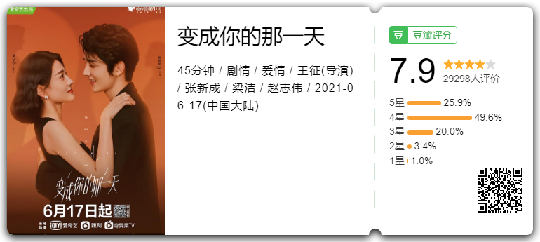 与《千古玦尘》同日上线,从各种角度看都是《千古玦尘》的反义词。《千古玦尘》,大IP,大制作,周冬雨+许凯,有话题度有流量的演员,从定角那天开始就万众瞩目,最后果然在万众嘲讽声中垮掉。而《变成你的那一天》,原创剧本,中等制作,张新成+梁洁,无甚出奇的配搭,到播出也没几个人知道有这部剧,播出后首页一片哈哈哈哈哈,口碑奇佳。![]()