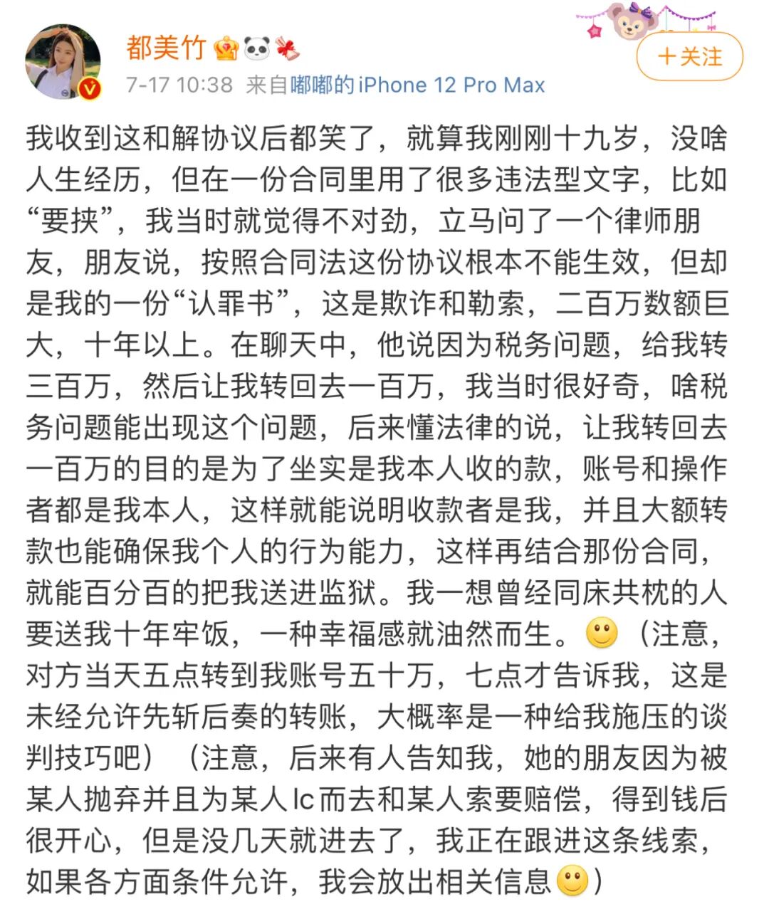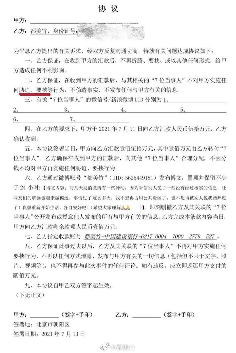 5、对方扔出一份和解协议让都美竹签署,并在协议未签署之前,未经告知就转账50万到都美竹账户。随后,都美竹抛出了这份所谓的和解协议,并在文字里写出了自己咨询专业人士后的猜测。![]()