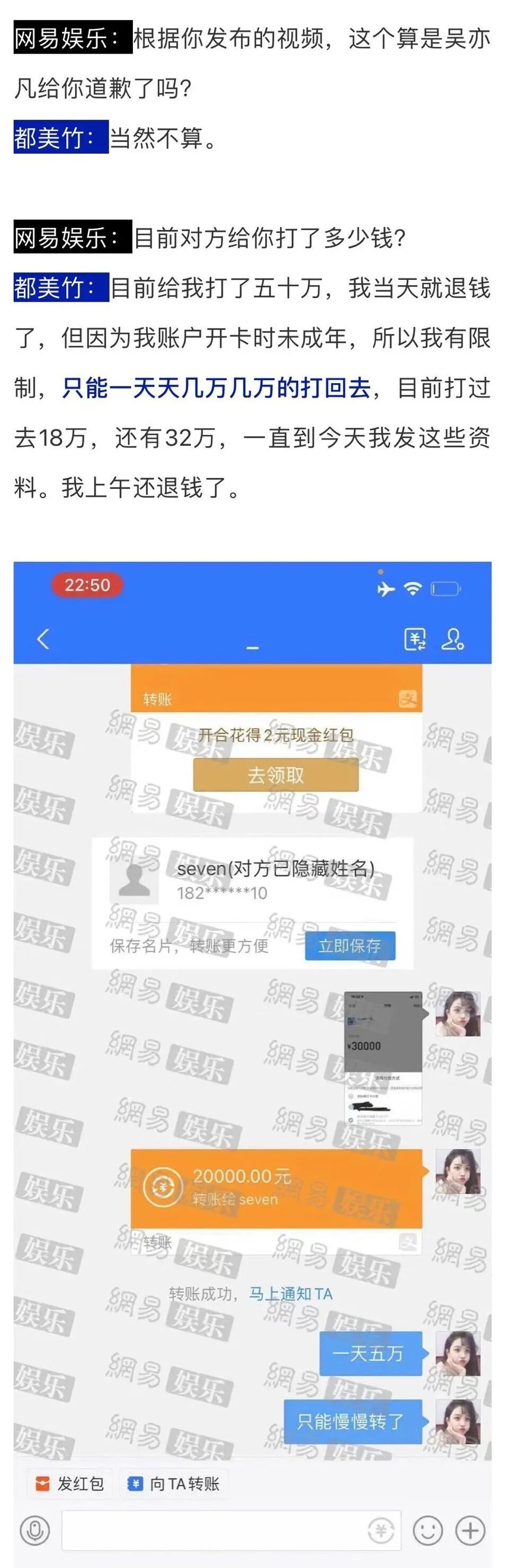 2、已分批转回未经告知打过来的50万元。在对方疑似下套送自己坐牢的行为发生后,都美竹和背后受害者决定不再接受对方的经济补偿方案,更想要一个道歉和解释。![]()