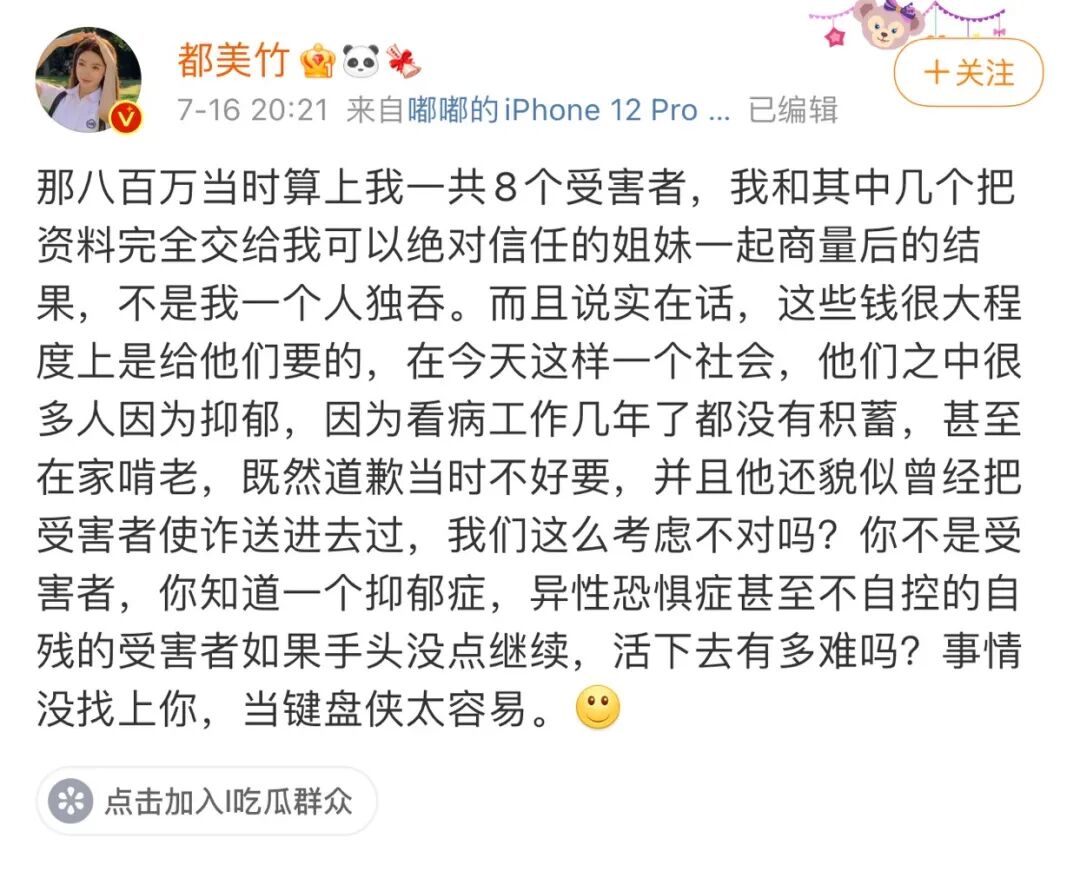 都美竹这边的进展我一直都在追。妹子的发言并不算多有条理,爆料节奏感也远远不如当年的李雨桐和去年的周扬青这类大网红,但这反而与她19岁的年龄,和她自陈焦虑惶恐+重度抑郁症状态相匹配,使得她的发言看起来更可信了一些。![]()