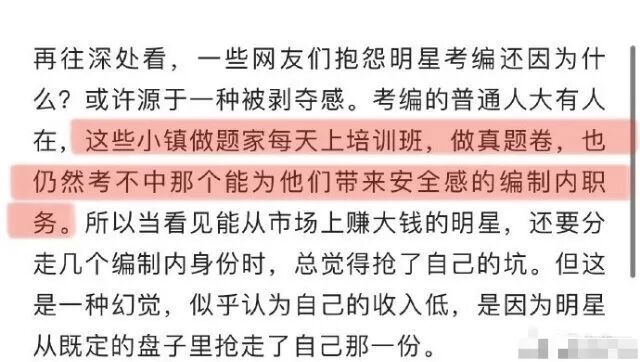极高收入下的既要又要,最容易点燃大众怒火。编制争议本已有熄火的趋势,一篇居高临下嘲讽“小镇做题家”的文章又再次拱火,彻底把事情搞出圈。郭德纲曾说,你在吃肉的时候别人在喝粥,即使你不分肉给他,但你能做到不吧唧嘴,我认为这就是善良。从明星的角度,要规避这种危机,请尽量善良。从根子上多感恩当下,晓得自家几斤几两重,不要过于贪婪,多考虑大众感受。另外,虽然业内营销都是一窝蜂——看别的明星有,所以我也要,但好歹顾及一下吃相,真要找营销点,也别太脱离现实,你总得配得上那溢美之词的5%吧?