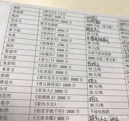 仅仅六年后,2016年,腾讯出品的《择天记》被爆出天价片酬,其中鹿晗的片酬被媒体曝光“过亿”,虽然片方否认,但一张网传图仿佛证实了不少明星的天价片酬。