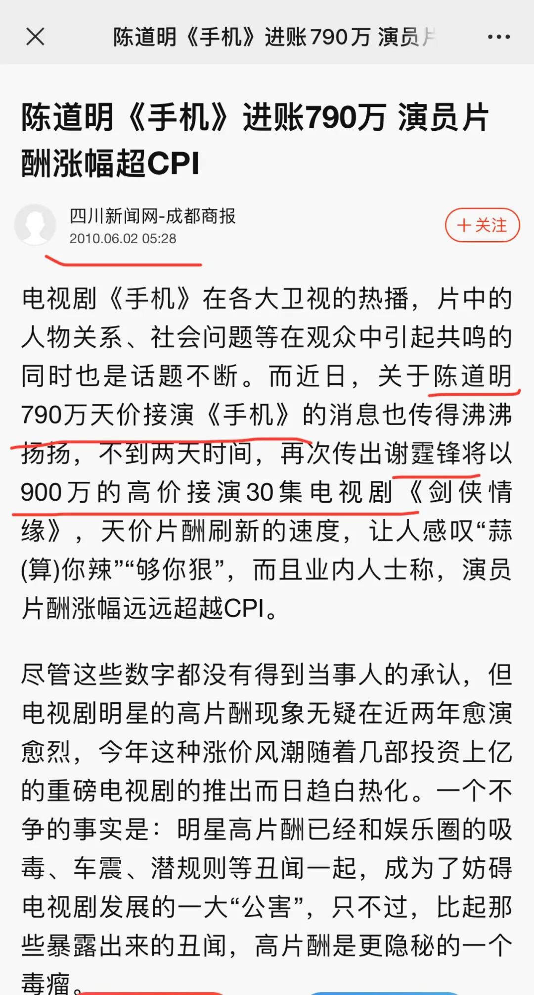 印象里,2010前后,内娱顶尖片酬是陈道明的20w左右一集,36集的《手机》拿到790w的片酬,已经是媒体口中的天价。而彼时在内娱更高贵的港台一线艺人,最高价格也不过是30w一集。![]()