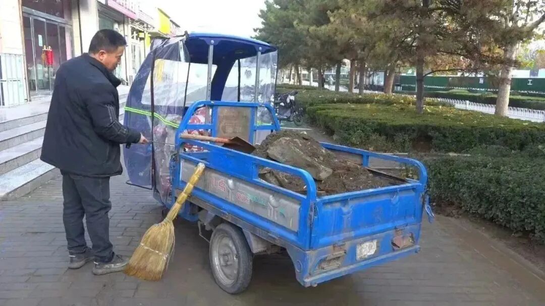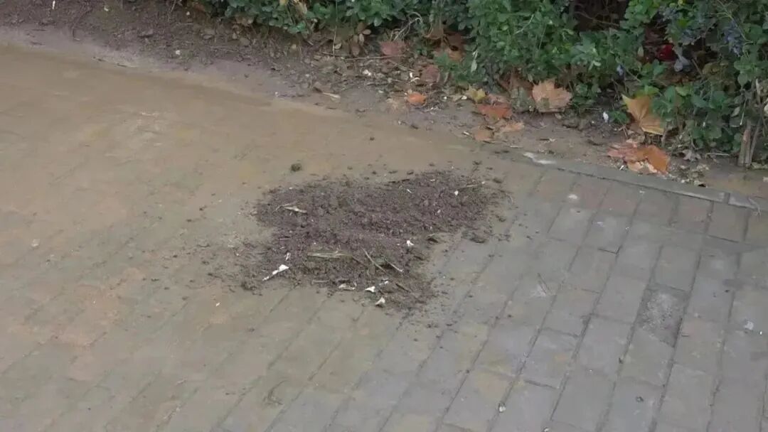 11月24日,环卫工人发现,在世纪城东门鲜花绿植商店门口,堆有土堆,周边杂草丛中有果皮、纸屑,影响市容市貌。