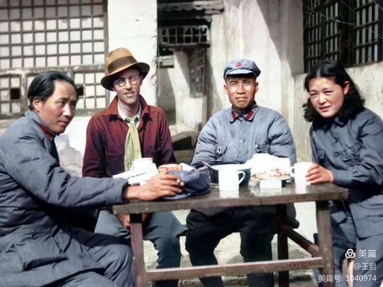 1937年3月,毛泽东、美国合众社驻天津记者厄尔利夫、朱德,女翻译吴光伟于延安。