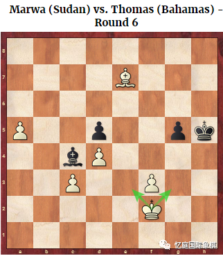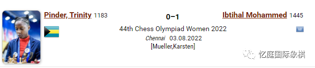 苏丹的穆罕默德·伊布蒂哈尔用黑棋击败了巴哈马的崔妮蒂·平德,因为后者在每方有两个兵的情况下,在兵的竞赛中犯了错误。