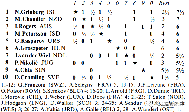 详情: I. G .卡斯帕罗夫 7分-2(包括公布的与E.Lanka、E.Sturua和P.Gabdrakhmanov的和棋); 2. E.斯特鲁瓦 7分;3. P.加布德拉赫曼诺夫 6.5分 4. A.瓦西里延科 6.5分 5-8. E. 兰卡、S.卢普延、A.哈里托诺夫和 L.尤尔塔耶夫 6分 9. A.尤苏波夫 5.5分 。女子世界冠军玛雅·奇布尔达尼泽获得了与她并肩举行的女子比赛冠军。