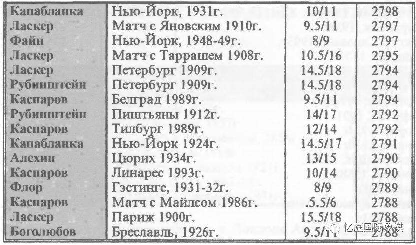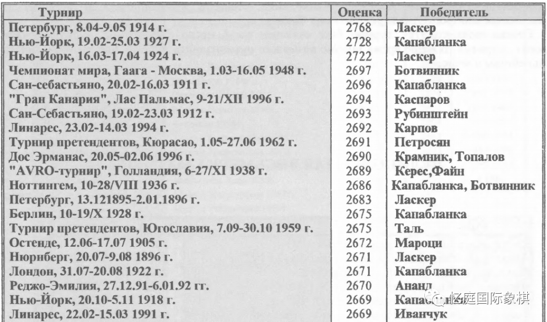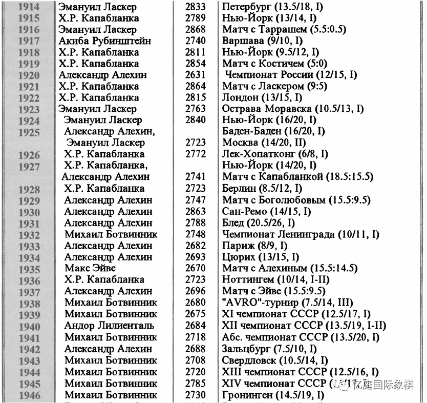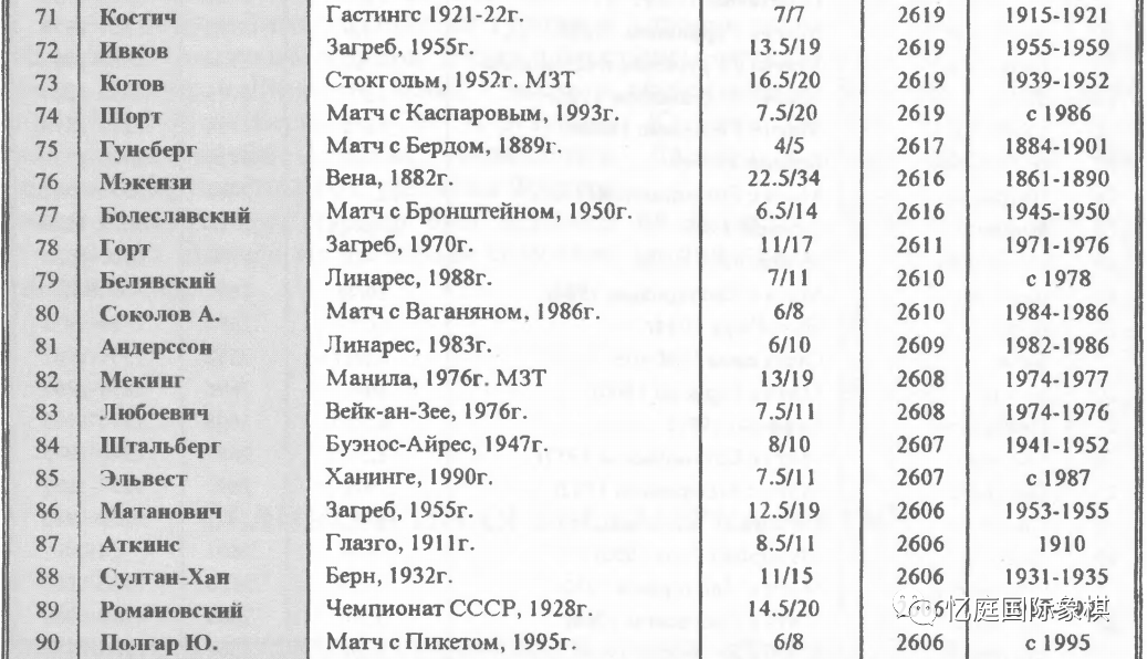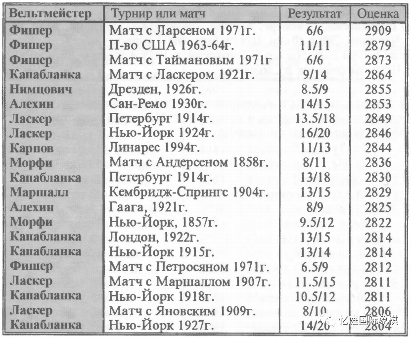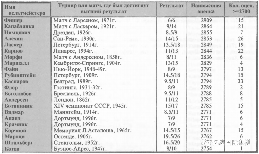 编者按:这是一本很有意思的书,作者收集了1851年至1996年的重大比赛数据,跨越时空,对历史上生活在不同时代的棋手,进行等级分计算,评测出每年的最佳棋手。本书资料翔实丰富,一书在手,百年国际象棋竞赛史尽在其中。可惜书籍是俄文,实在难懂,期待有心人,日后能翻译出来,让更多的爱好者能一睹其貌,别让这些信息淹没在历史的尘埃中。以下翻译仅供参考。