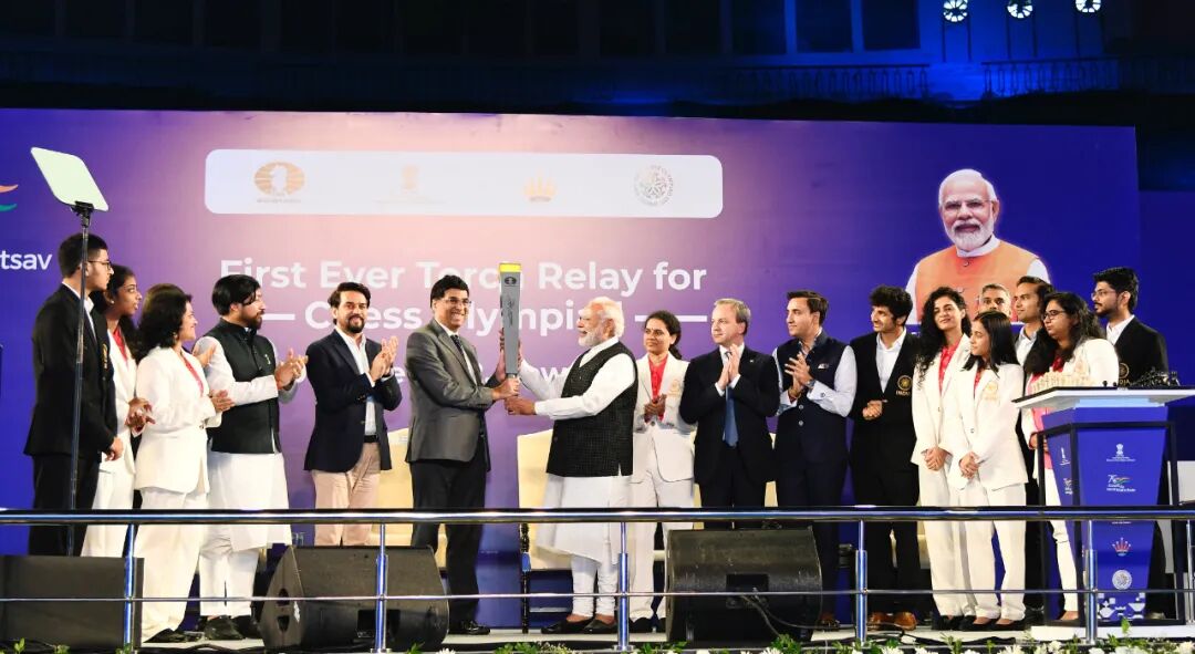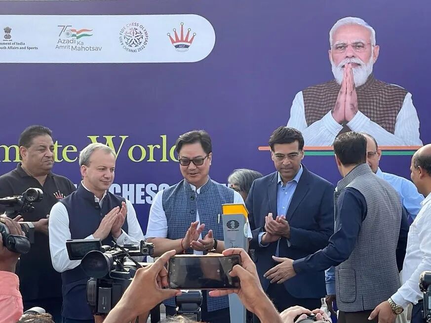 火炬接力的第一棒是印度传奇棋手前世界冠军阿南德,他从印度总理莫迪手中接过火炬后,将火炬传给了印度联邦法律和司法部部长 Kiren Rijiju 先生。