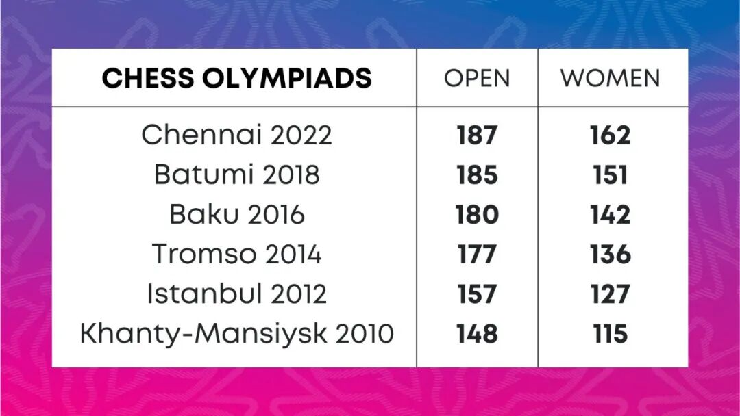 7月2日,国际棋联在官网公布了第44届国际象棋奥林匹克团体赛的参赛队伍名单。男女组参赛队伍数量均创历史纪录:男子组(公开组)共有187支队伍报名参赛。女子组共有162支队伍参赛。公开组和女子组的参赛队伍数量均创奥赛历史纪录!