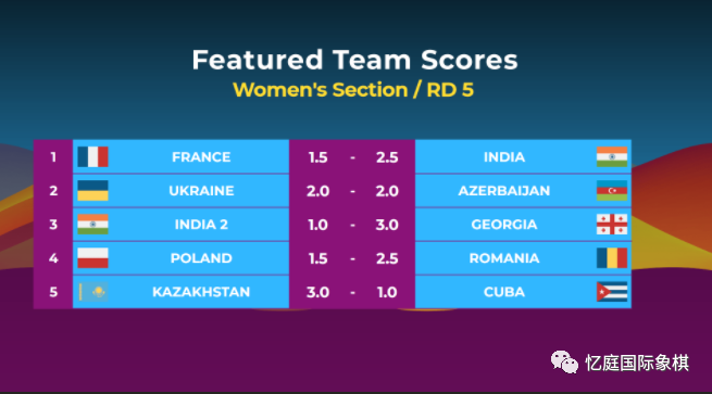 在第四十四届国际棋联国际象棋奥赛第五轮结束时,11号种子印度2队爆冷击败4号种子西班牙队,12号种子亚美尼亚队以2.5-1.5的相同比分击败10号种子英国队,以10分并列第一。年轻的GM 多姆马拉朱·古克什在印度2队的第一台上击败了传奇GM 阿列克谢·希洛夫,这将是当天最值得关注的对局。