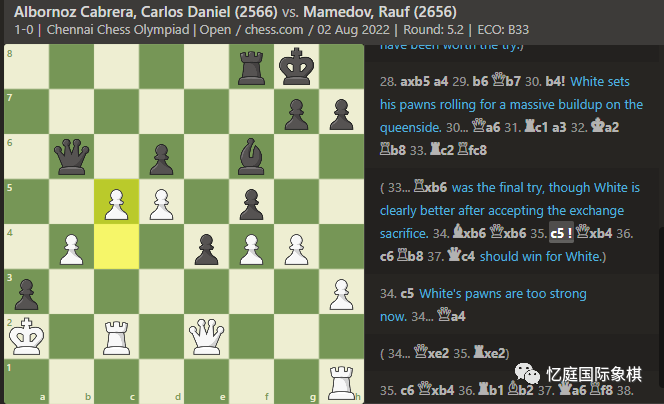 古巴战胜阿塞拜疆的比赛中,GM卡洛斯-丹尼尔-阿尔伯诺兹-卡布雷拉下了一盘漂亮的棋:
