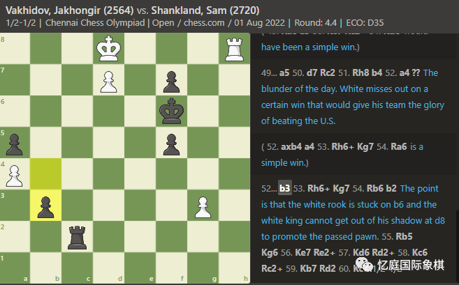 GM 萨姆·尚克兰幸免于难,给了他的棋队一个急需的平局,防止了一场令人沮丧的失败。他从一个看起来很危险的局面努力战斗,以车残局结束比赛,迫使比赛以平局结束:
