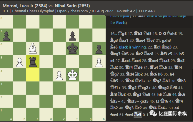 另一位印度神童GM 尼哈尔-萨林在第二台出人意料地轻松获胜,击败了GM 卢卡·莫罗尼: