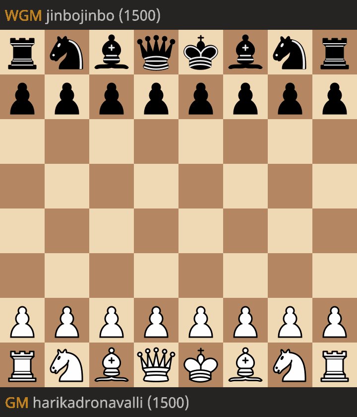 第一盘快棋,双方大战64个回合,最终在车兵残局中战成和棋。前半盘,执白先行的哈丽卡一直把握局面主动,但未能进一步扩大优势。战至残局后,朱锦尔一度反夺主动。可惜在第44回合,朱锦尔错过了一个绝佳的赢棋战术机会,最终形成官和局面后,双方三次重复不变作和。