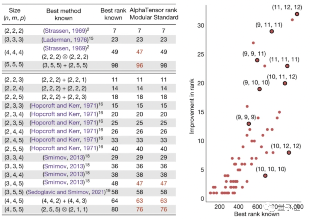 具体而言,AlphaTensor一共改进了70多种不同大小矩阵的计算方法。