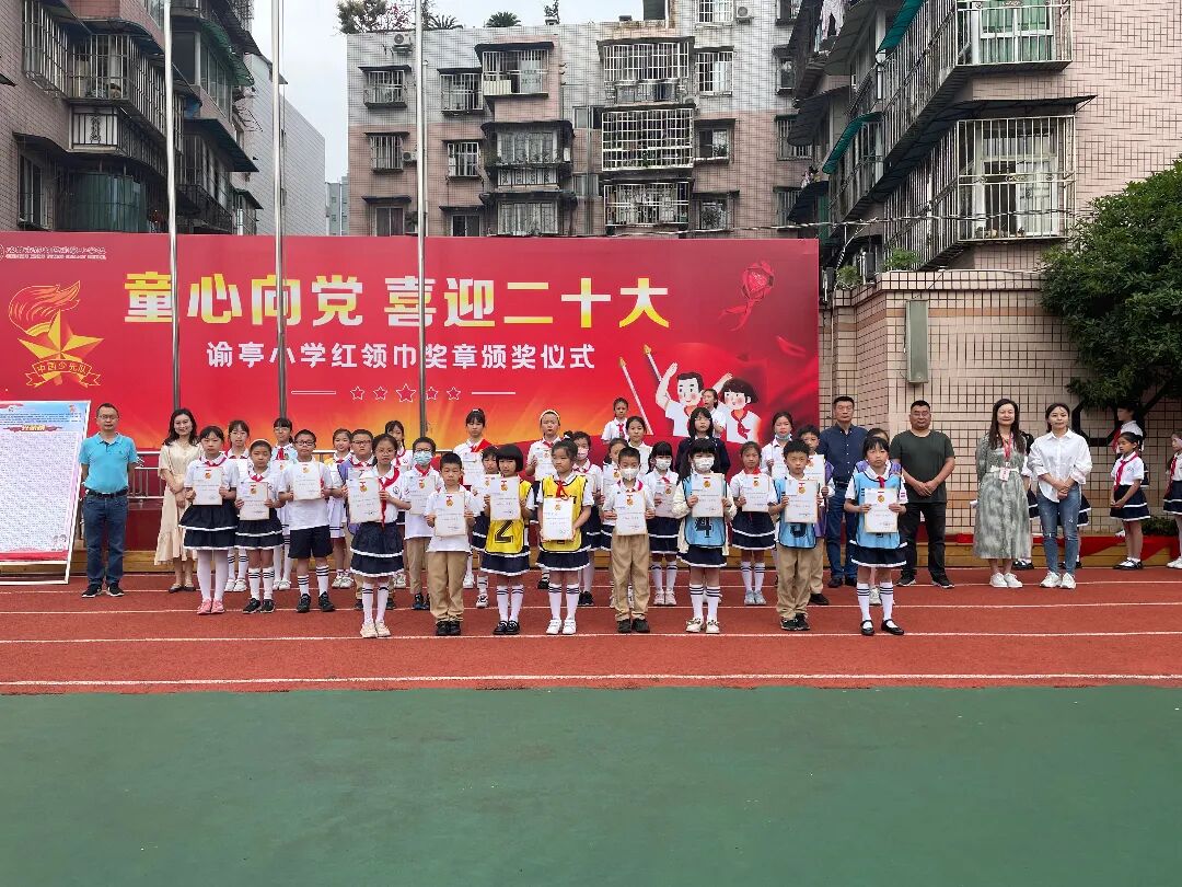 不知不觉中,五月已接近尾声,不知不觉中,我们向红领巾争章活动迈进了。5月23日清晨,“童心向党喜迎二十大”谕亭小学红领巾奖章颁章典礼在谕亭小学本部校区、毗河校区同时举行。全体辅导员、少先队员和一年级预备队员参加活动。
