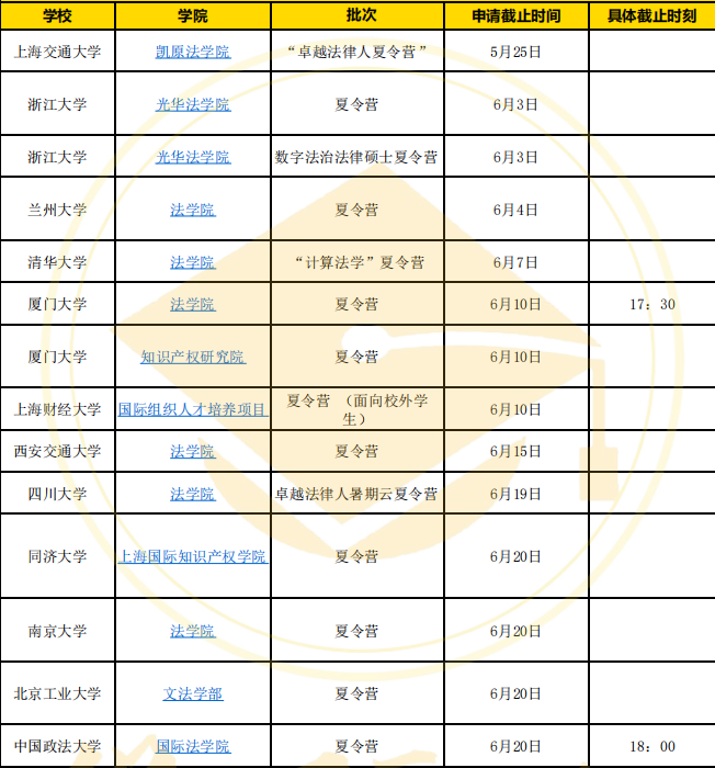浙江大学光华法学院夏令营(6月3日);清华大学法学院“计算法学”夏令营(6月7日);同济大学上海国际知识产权学院夏令营(6月20日);华东政法大学知识产权学院“与名师面对面”夏令营(6月20日)