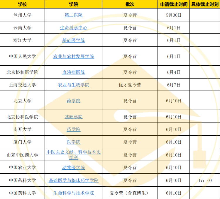 云南大学生命科学中心夏令营(6月1日);南开大学药学院夏令营(6月10日);复旦大学基础医学院夏令营(6月15日);中国医学研究所药物研究所夏令营(6月20日);中国农业科学院作物科学研究所夏令营(6月30日)。