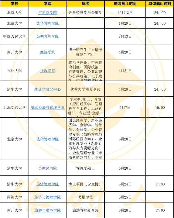 华中农业大学经济管理学院(7月1日);中山大学国际金融学院(7月2日);大连理工大学经济管理学院学术夏令营(7月5日24:00);中国人民大学公共管理学院(7月10日);中国社会科学院大学经济学院夏令营(7月15日);上海交通大学上海高级金融学院金融硕士项目夏令营(7月18日)