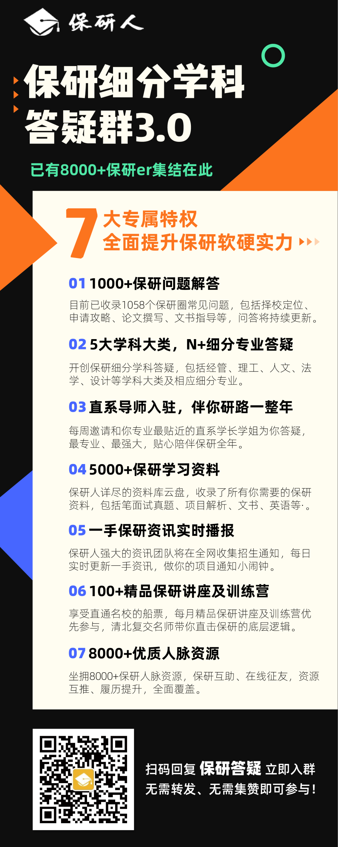 不同于把所有保研er拉到一个答疑群的方式,保研人21年答疑群我们开放了理工、经管、法学、人文四大方向,让答疑更有针对性;