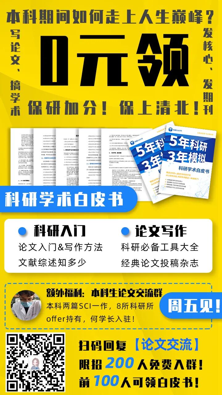 为了帮大家搞定科研,我们特开设——本科生论文交流群,每周五大牛学长答疑(学长本科就发了两篇SCI一作),入群+赠《科研学术白皮书》!从0到1写论文!