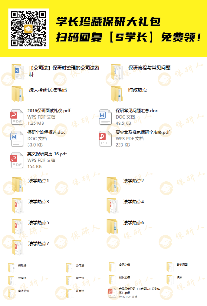 学长个人独家珍藏的夏令营资料大礼包免费分享给大家啦!保研面试礼仪、保研常见问题汇总、夏令营及推免保研全攻略、法大考研民法笔记、时政热点……夏令营需要准备的资料都在里面!