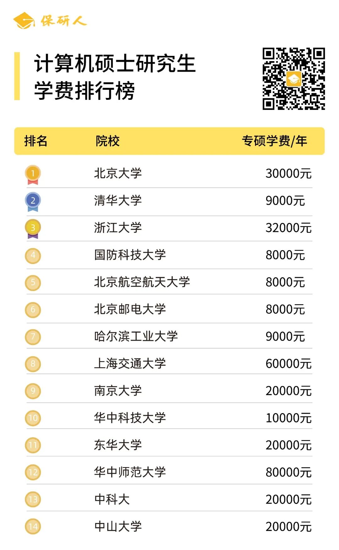最后是理工类的大热门专业计算机硕士,随着近些年互联网的猛烈发展,计算机专业的报考人数和学费也是水涨船高,平均学费涨到1.84w。从top10数据看,相比于专业排名,名校招牌与学费的相关性更高——如南京大学2w/年,北京大学3w/年,浙江大学3.2w/年,上海交通大学以6w/年的学费再次蝉联第一。上交,不愧是你!