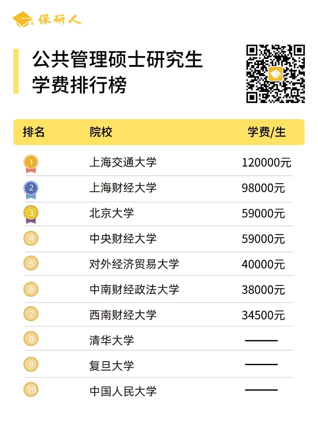 上海交通大学更是在经管专业学费中获得两个第一:公共管理专业学费12w,工商管理专业学费32.8w,是的你没有看错,是328000元。