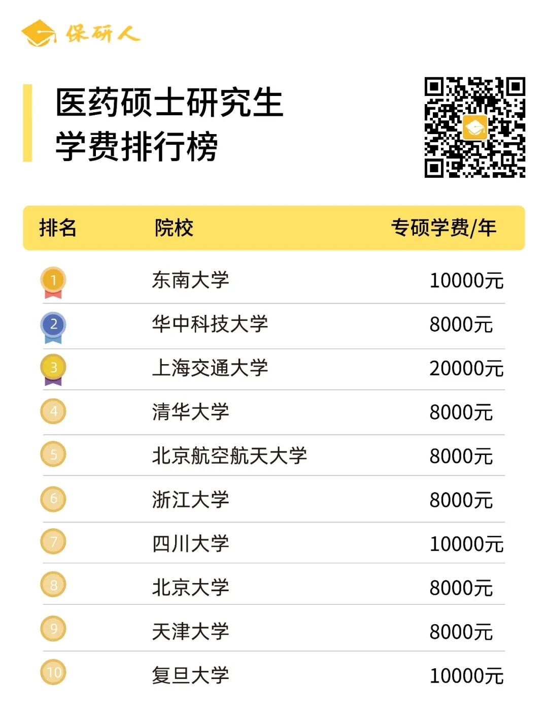 首先来看理工类的医药硕士,平均学费在8.8k/年,大部分院校在8k-10k范围内,只有学科排名第四的上海交通大学比较突出,学费为2w/年。