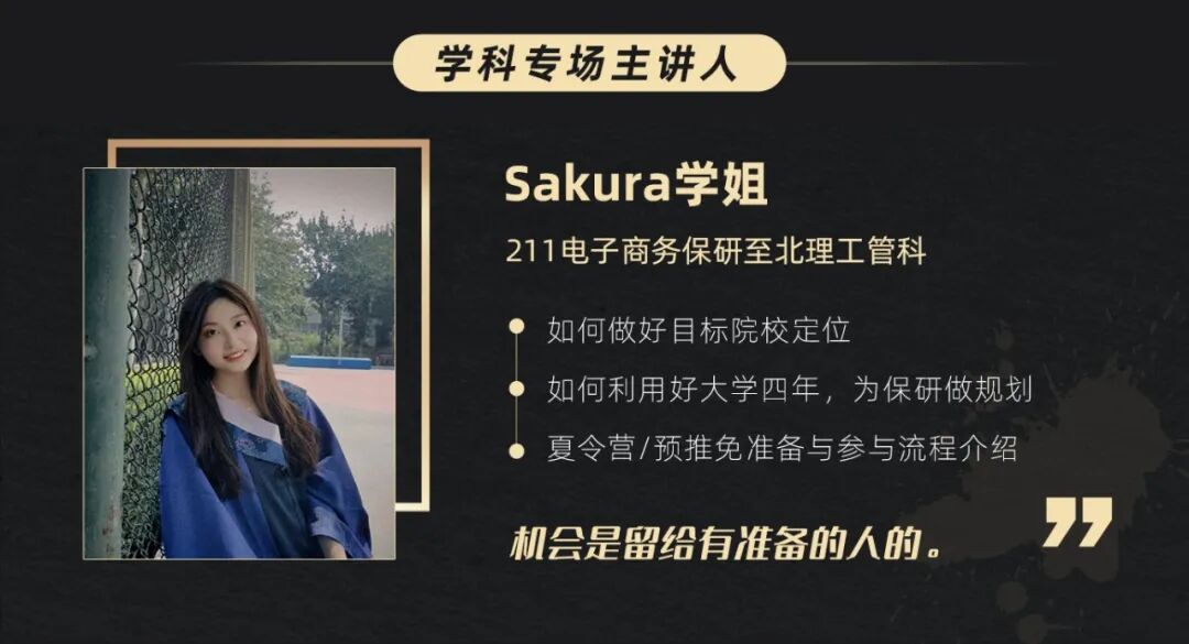 在即将到来的第九届保研人万人公益讲座上,Sakura学姐将会给大家分享更多关于管课保研经历以及择校定位相关的建议,期待与大家在讲座上见面鸭!
