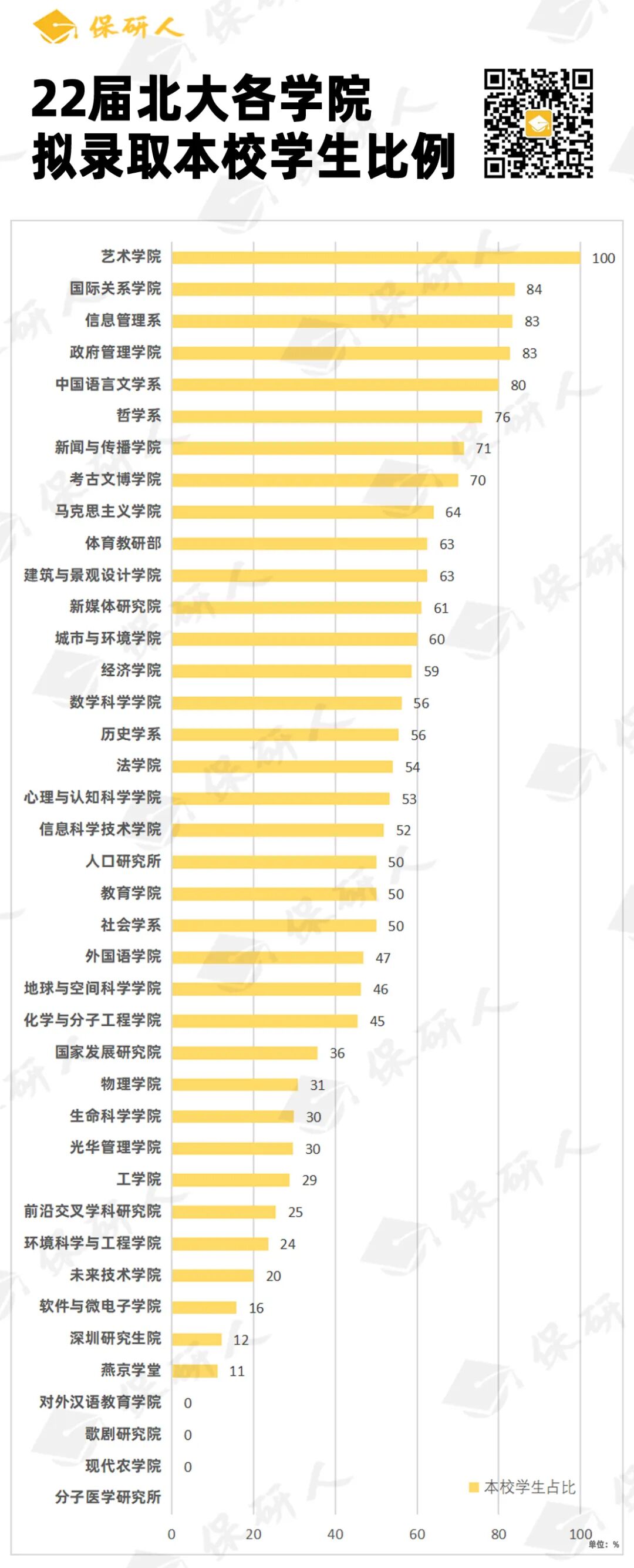 在41个招生单位里,有22个学院北大推免生达50%以上。艺术学院(100%)、国际关系学院(84%)、信息管理系(83%)、政府管理学院(83%)、中国语言文学系(80%)5所学院北大本校生占比在80%及以上。