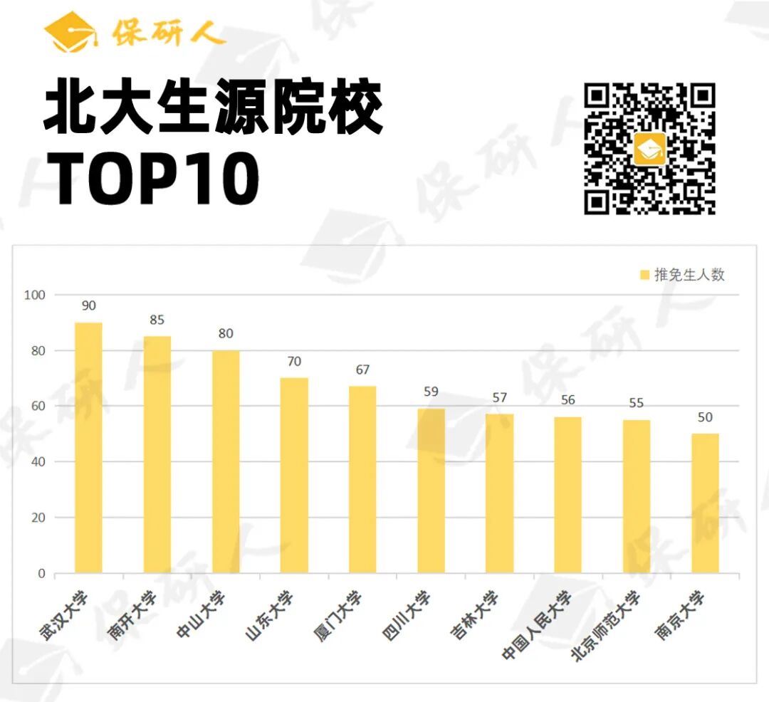 2022届的推免生来源前10的高校,除本校外,武汉大学、南开大学、中山大学分别以90人、85人、80人的推免生输送抢占生源偏好前三,山东大学、厦门大学、四川大学、吉林大学、中国人民大学、北京师范大学、南京大学上岸北大的人数分列4-10位。