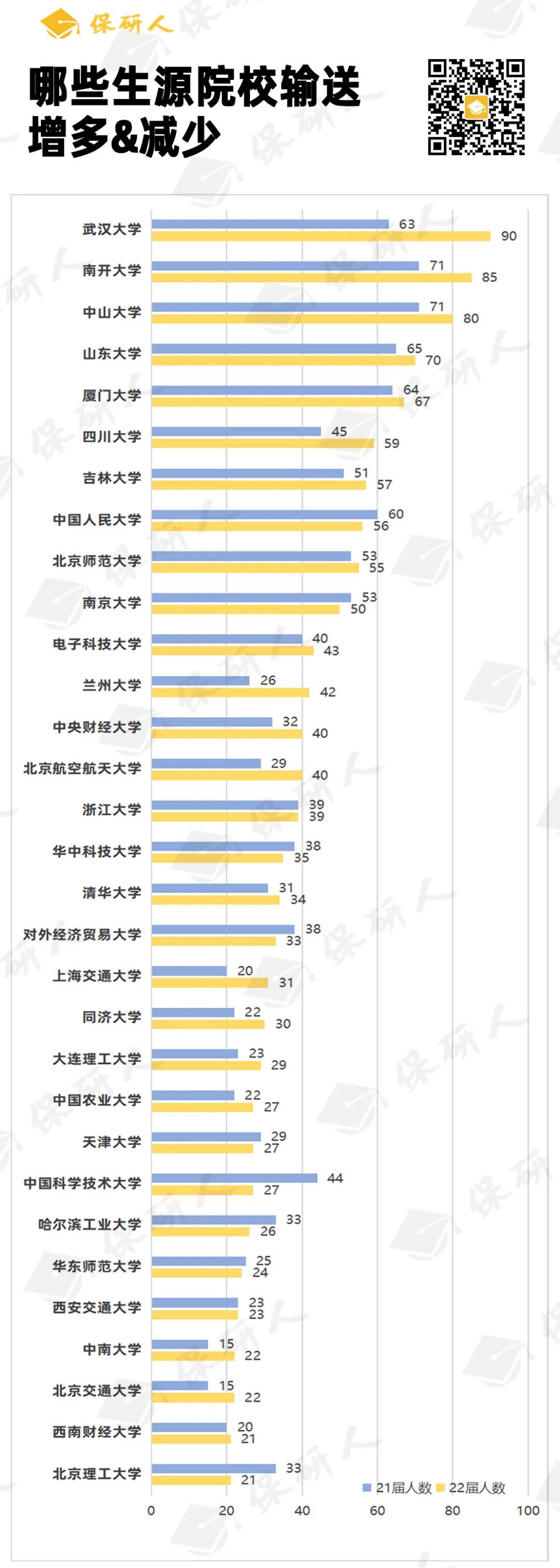 对比2021年数据,22年北大的主要推免生源学校人数波动如下,可以看到,武汉大学、兰州大学、四川大学保研至北大的人数明显增加;浙江大学、中国人民大学、华中科技大学、清华大学等录取人数基本稳定;中科大、哈工大、北理工的生源输送明显减少。