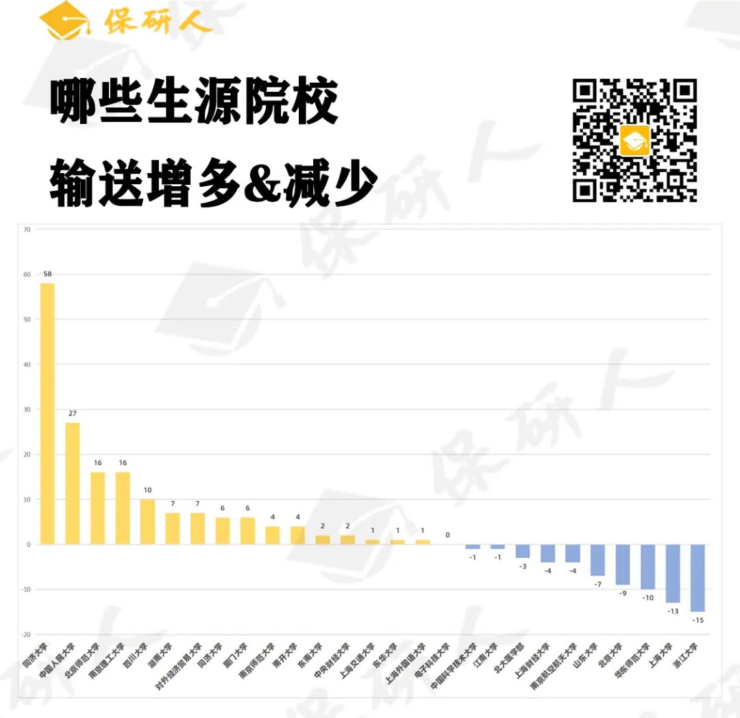 此外,复旦对人大、北京师范大学和南京理工大学等学校的推免生也都有比较多的增收;而对浙大、上海大学以及华东师范大学等高校的推免生都有不同程度的缩招。