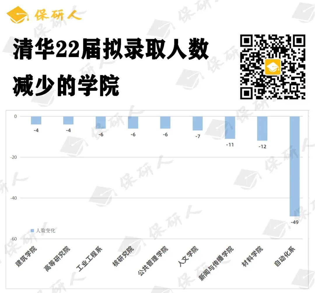 虽然大部分学院的录取人数都略有增长,但还有少部分学院录取人数略有缩减。其中,自动化系22届拟录取人数缩减49人,缩减幅度最大,其次为材料学院(-12人)、新闻传播学院(-11人)与人文学院(-7人)。