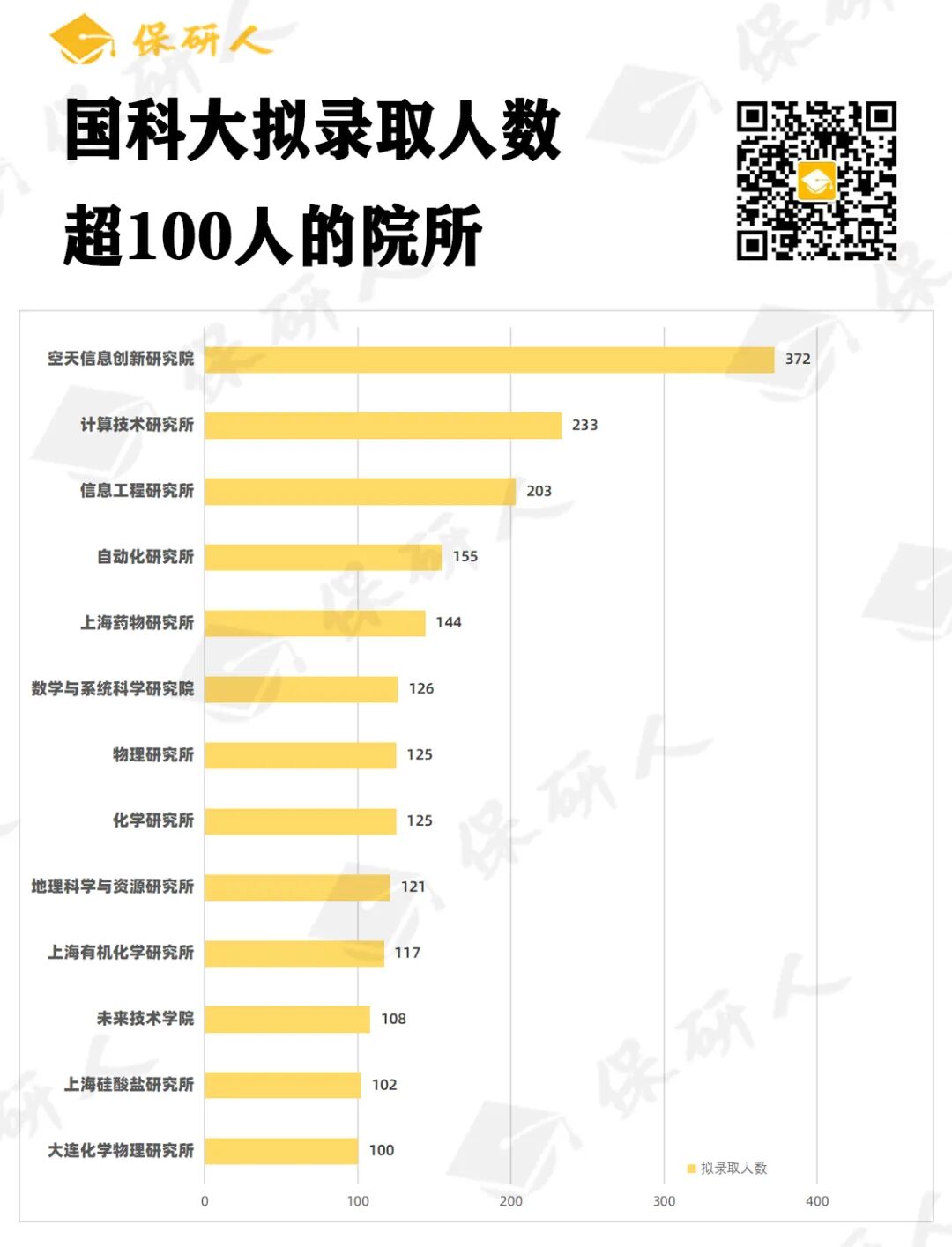 从各个院所的招生数量来看,空天信息创新研究院拟录取的人数最多,为372人;此外,像计算技术研究所、信息工程研究所、自动化研究所、上海药物研究所、数学与系统科学研究院等院所的招生人数都非常多,均超过了100人。