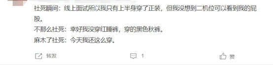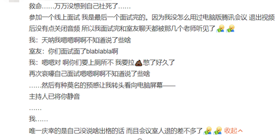 除此之外,与线下面试相比,线上面试较之传统的线下面试多了许多不确定的因素,诸如信号不稳定、画面卡顿、声音不清晰等因素对面试影响还是比较大的,轻则“社死”,重则错失offer。