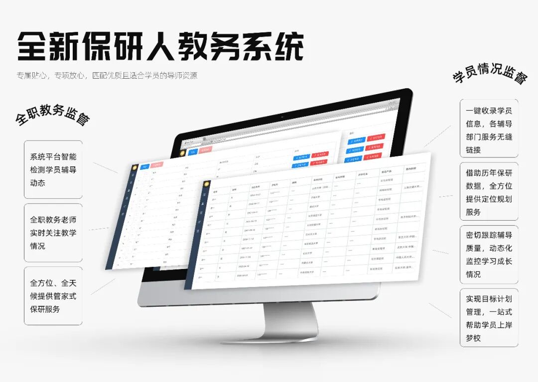 一键收录学员信息,各辅导部门无缝链接,借助历年保研大数据,提供专属定位规划服务,实现目标计划管理,动态监控学员的学习成长情况,一站式帮助学员上岸梦校!