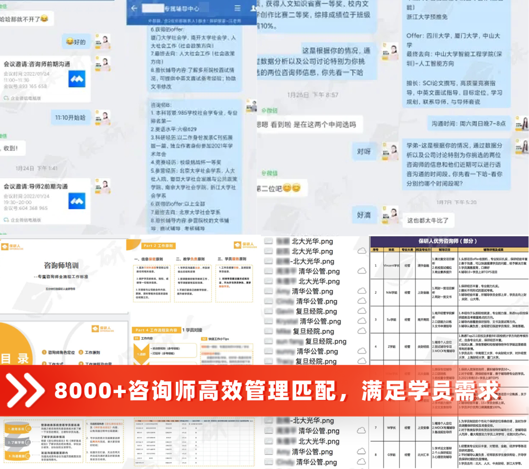 针对你的保研需求,我们全新升级的“保研人教务系统”会作出最优匹配方案,名校导师多对一、深度个性化贴合辅导项目、专属咨询师、教务教学三方合力为你提供最佳培训服务。