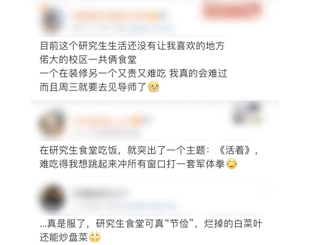 这方面的信息壁垒,使得部分同学的读研体验十分糟糕。其他学校的朋友住豪华单人间,自己却挤在老破小16人间;别人的食堂便宜大碗还好吃,自己只能吃又贵又随机的食堂;别人周末在学校附近吃喝玩乐一条龙,自己却要坐车辗转一两个小时进市区……
