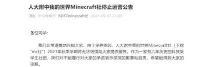 但在防沉迷新规正式实施不到一周后,人大附中MC社便发出公告宣布停止运营。