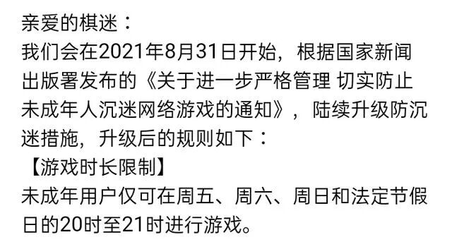 这次国内的防沉迷新政策来得雷厉风行,不论在覆盖范围还是执行力度上,都当得上“最严”二字。在其影响下,国内用户数最多的两个围棋对战平台,也很快发出了《防沉迷措施升级公告》,宣布将落实新政、对未成年用户进行限制。