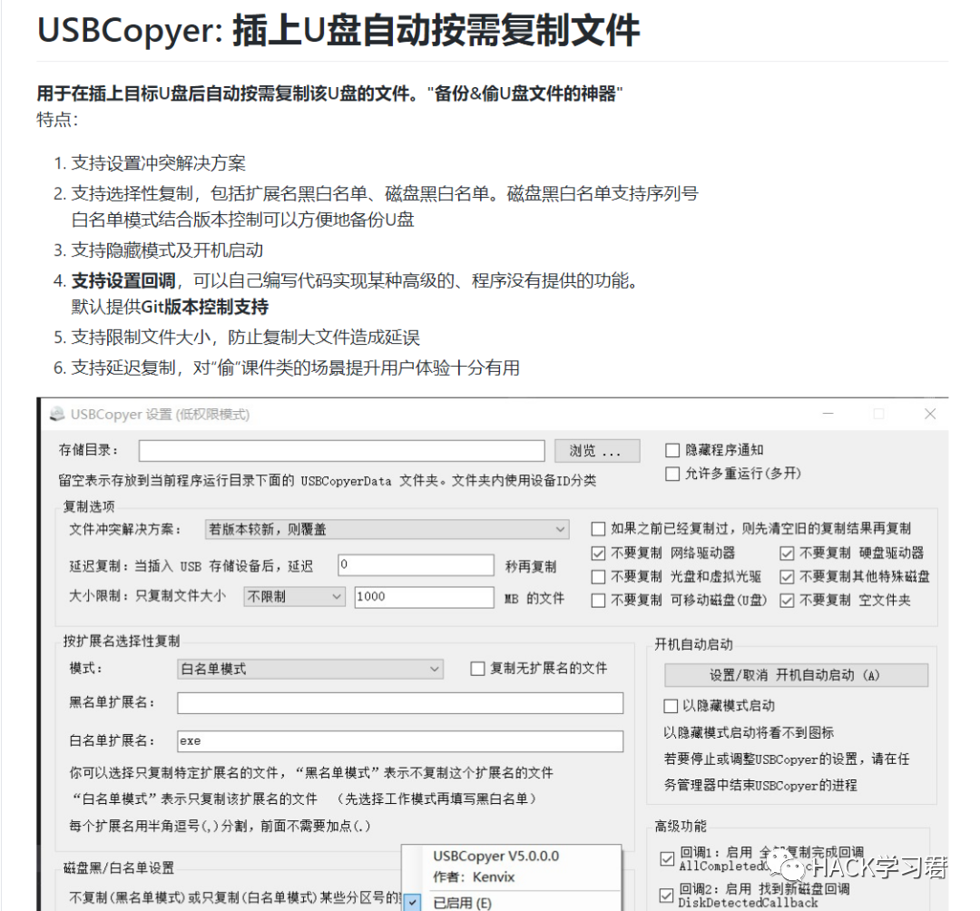 用于在插上目标U盘后自动按需复制该U盘的文件。"备份&偷U盘文件的神器"