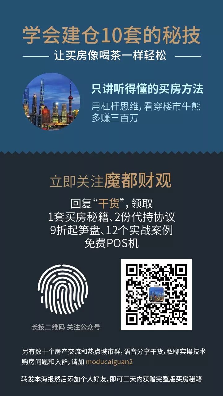 长按下方二维码关注“魔都财观”。只讲看得懂、用得上的实操细节。如果你觉得文章有用请转发朋友圈,一起探讨。另有数十个房产交流和热点城市群,语音分享干货,私聊实操技术。购房问题和入群,请加moducaiguan2