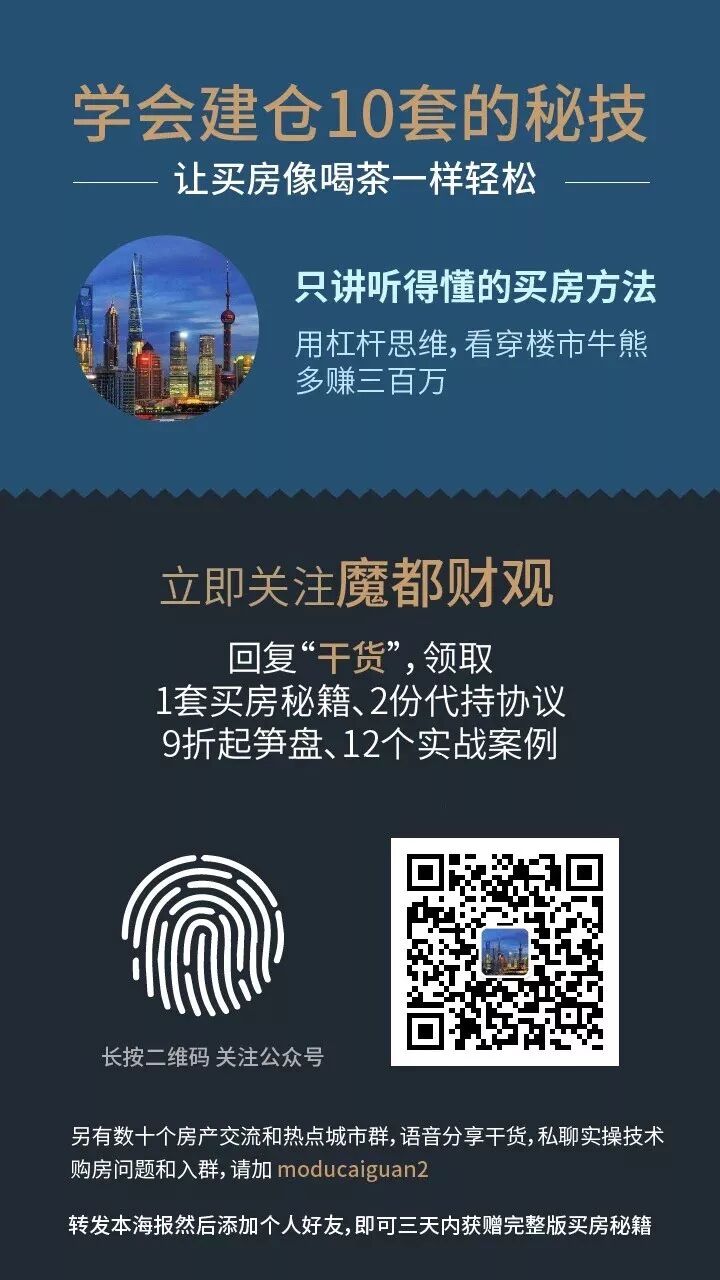 长按上方二维码关注“魔都财观”。只讲看得懂、用得上的实操细节。如果你觉得文章有用请转发朋友圈,一起探讨。另有数十个房产交流和热点城市群,语音分享干货,私聊实操技术。购房问题和入群,请加阿闪(moducaiguan3)。