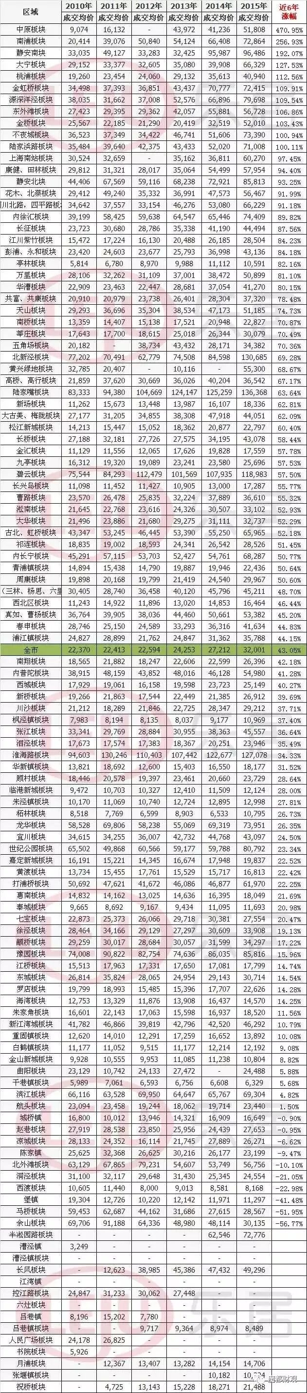 借用上海乐居对2010-2015年间上海各板块新房涨幅的统计数据,我们可以发现,在那段时间,涨幅榜前列的居然一大部分都是内环线核心板块,与现在受欢迎的“郊区涨的快”的论调恰恰相反。