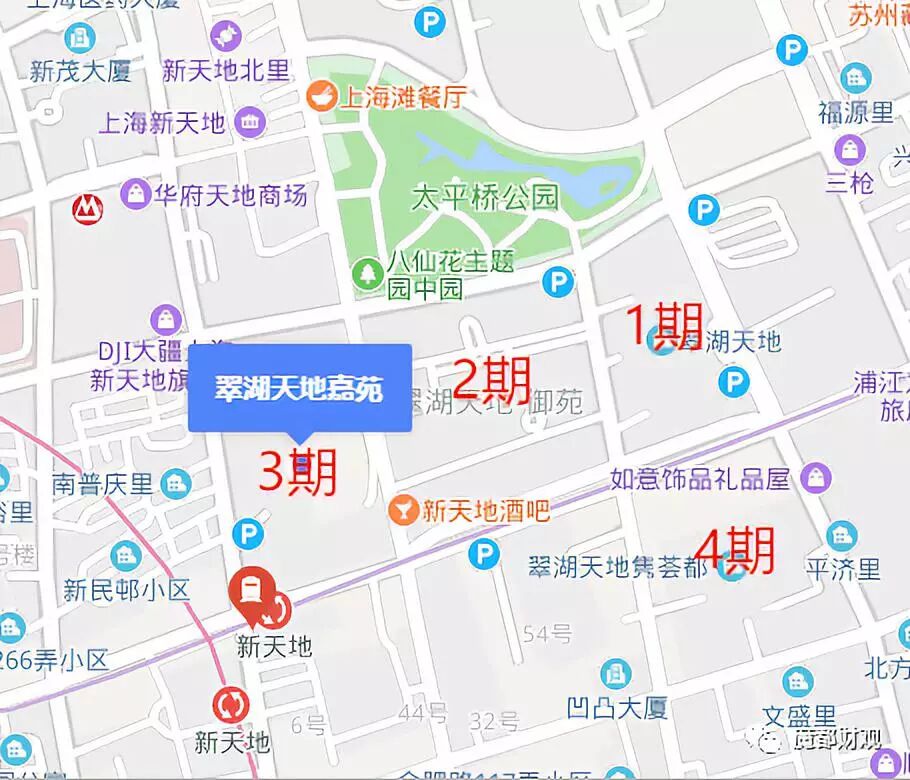 就算是同一开发商多期开发的项目,前几期的位置都是优于后几期的。浦西老牌豪宅翠湖天地就是个很好的例子,由香港开发商瑞安耕耘20年开发。翠湖1、2、3期伴随着周边商业和太平桥公园的成长,占据了新天地的最佳C位,而最新的4期就明显不如了,严格地来说,属于老西门板块。